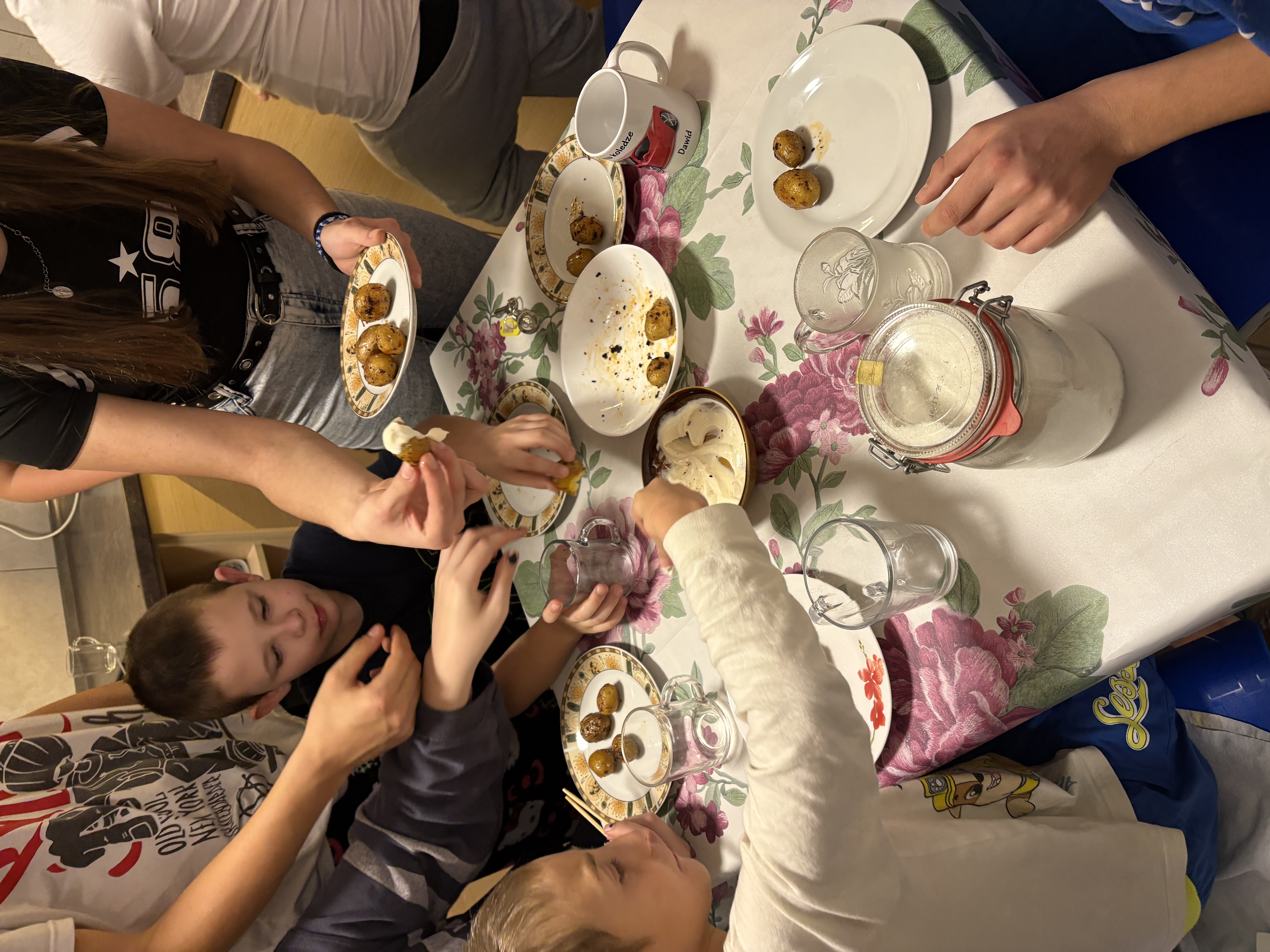 W naszej kuchni zrobiło się wyjątkowo aromatycznie. Wychowankowie przygotowali pyszne jesienne pieczone ziemniaki oraz rozgrzewającą herbatę. Zajęcia upłynęły w prawdziwie jesiennym klimacie – pełnym zapachu cynamonu i goździków.