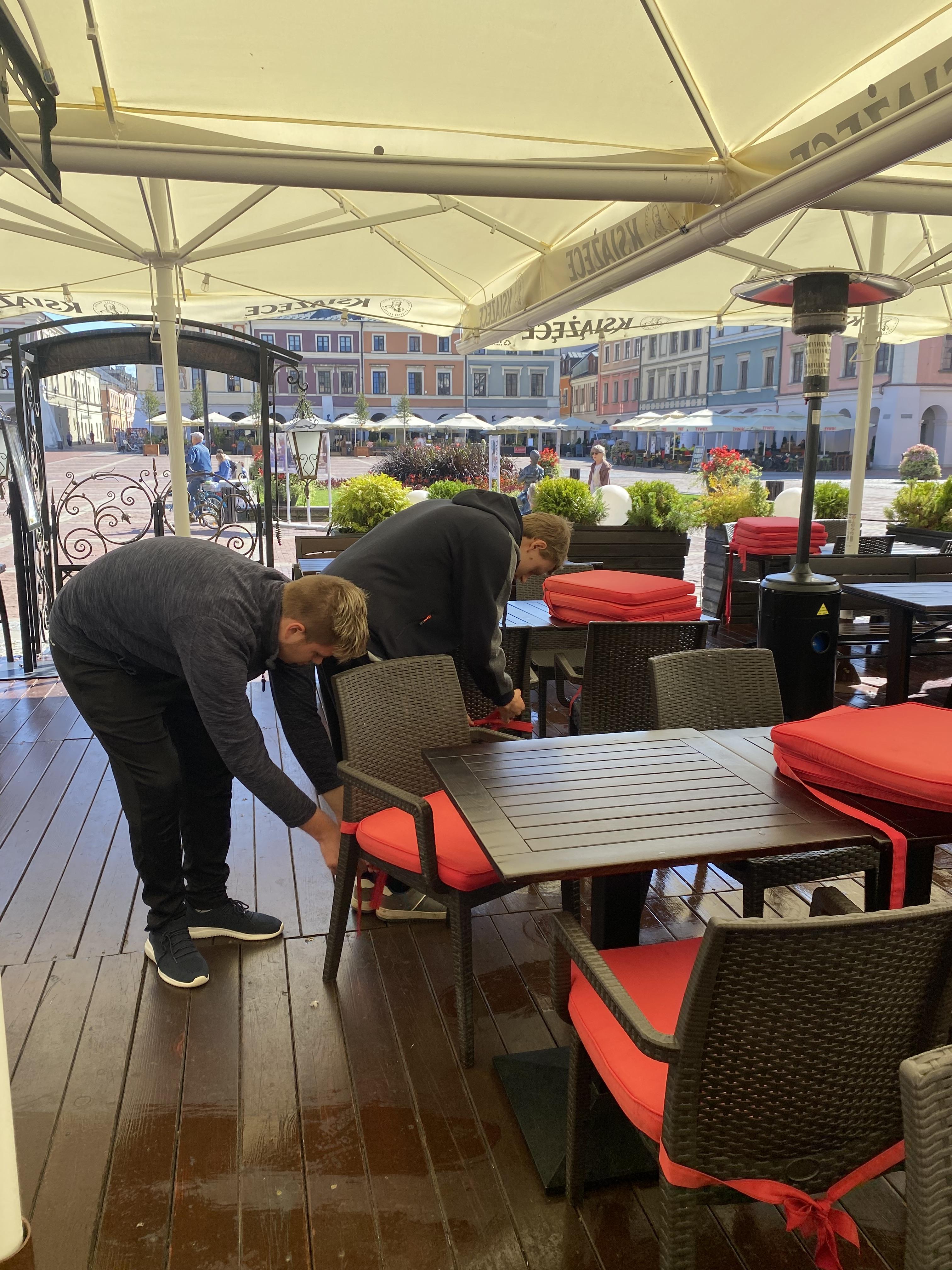 Trening umiejętności społecznych: klient – kelner, nauka przyjmowania zamówienia z karty menu, savoir vivre w pracy kelnera, odbył się dzięki uprzejmości Restauracji Verona na zamojskiej starówce. Obserwacja wykonywanych czynności pracy pracowników restauracji oraz wspólne działania przed otwarciem restauracji (aranżacja stołów, ustawianie krzesełek, zakładanie poduch na krzesełka) były okazją do nauki w realnym środowisku pracy.