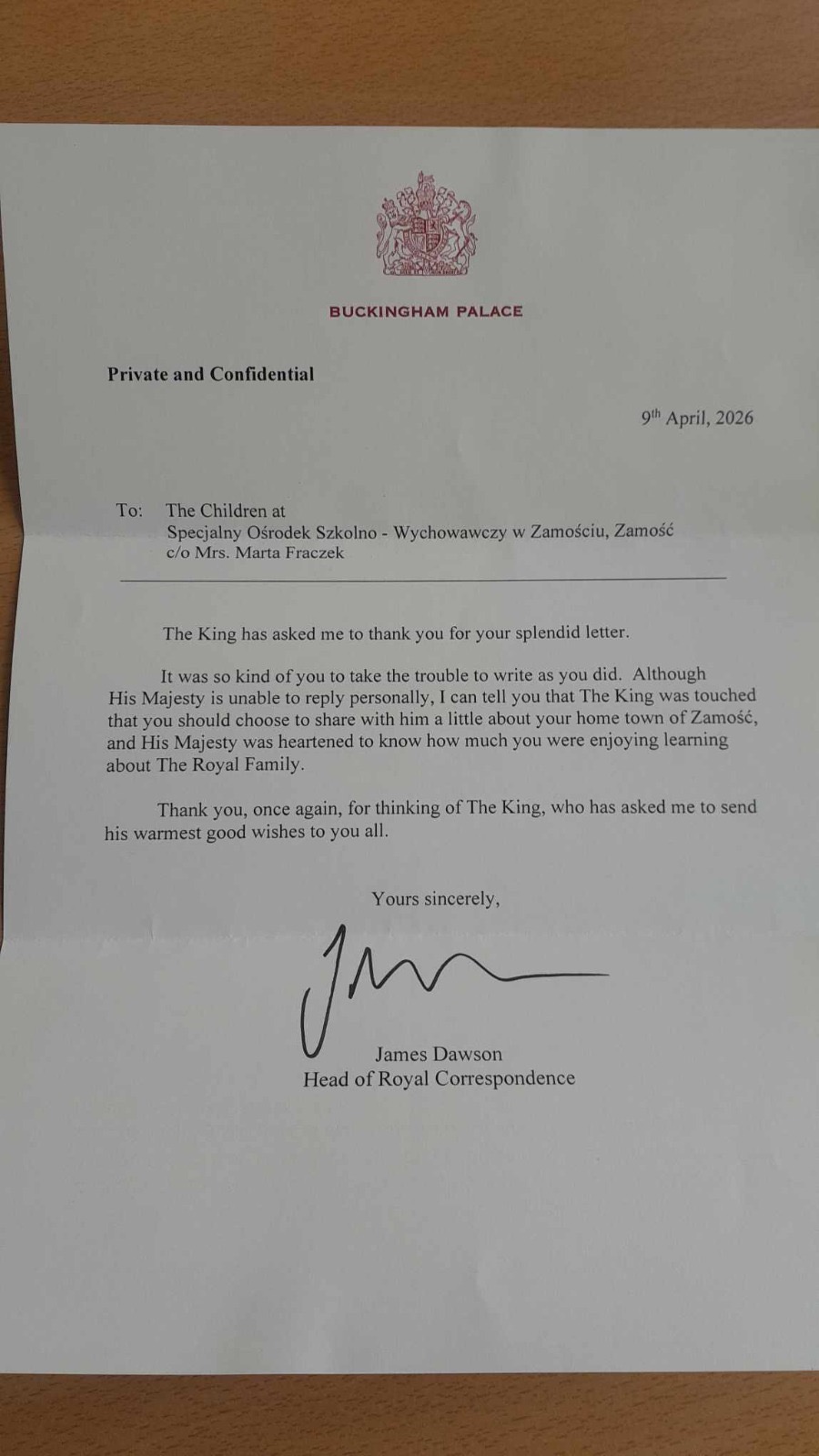 W oficjalnym piśmie przesłanym w imieniu Monarchy przez Jamesa Dawsona (Head of Royal Correspondence), czytamy m.in.: