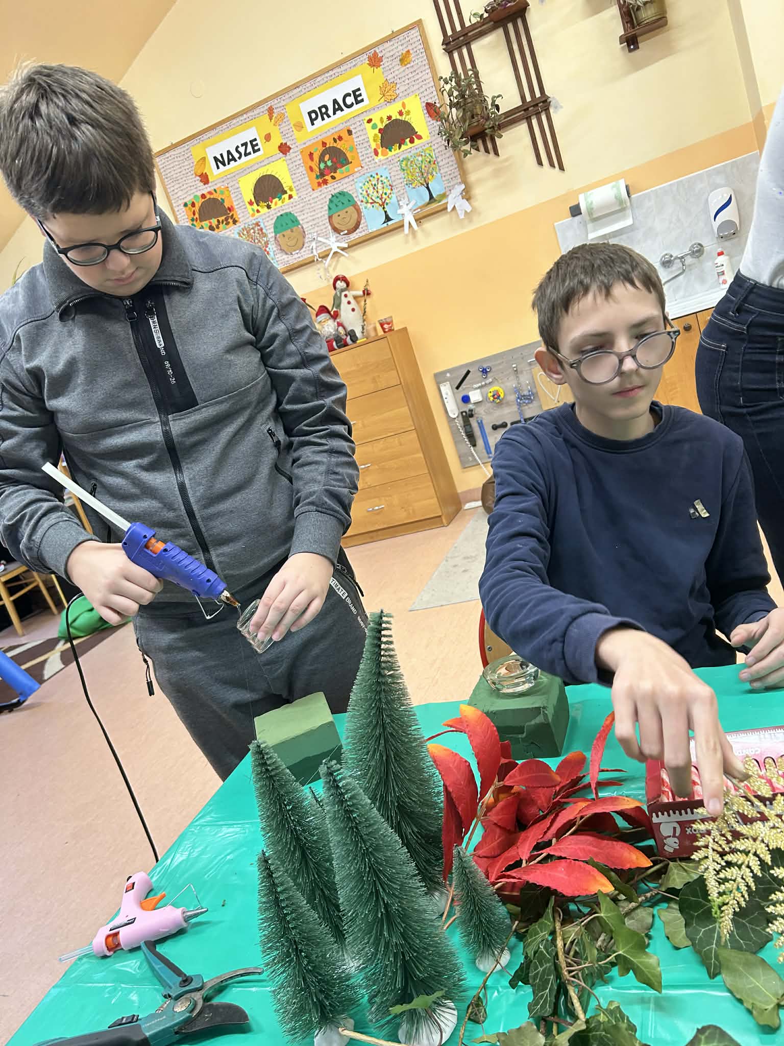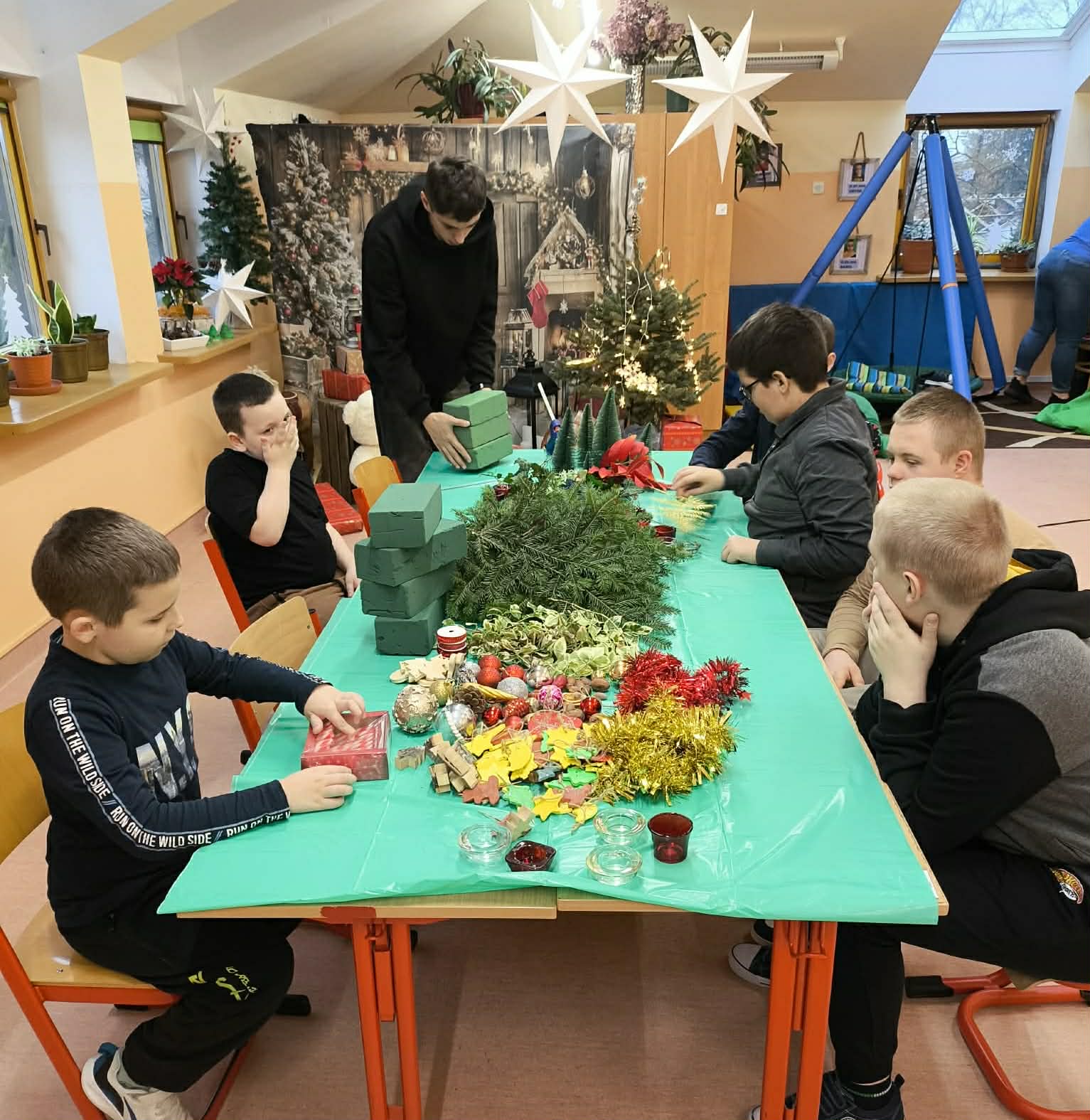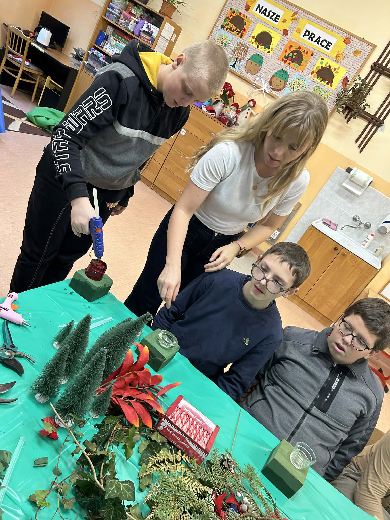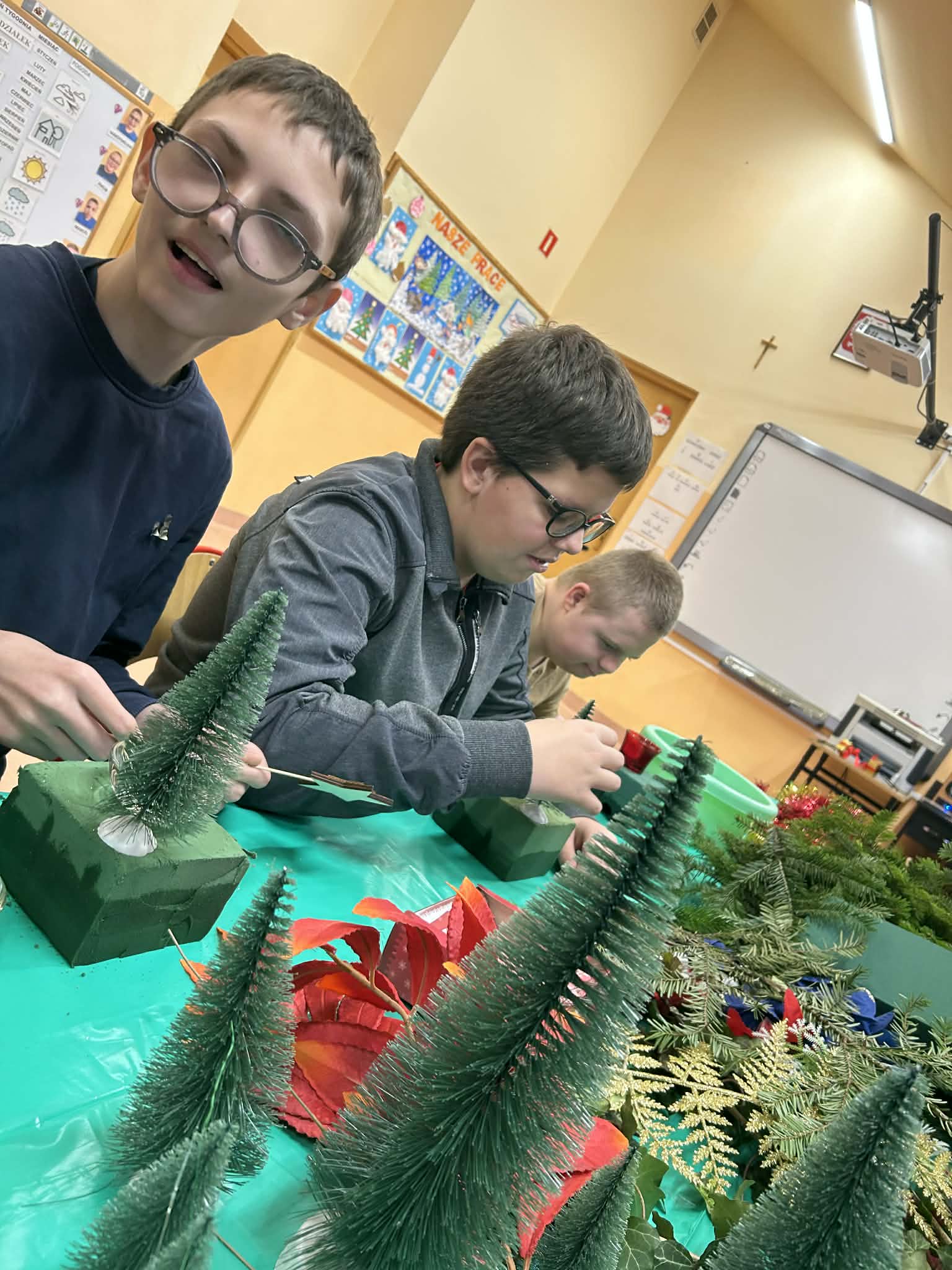 Podczas pracy nie zabrakło również wyjątkowego klimatu – wspólne śpiewanie kolęd sprawiło, że zajęcia nabrały prawdziwie magicznego charakteru. Uczniowie uczyli się współpracy, cierpliwości i dokładności, a przy tym świetnie się bawili.