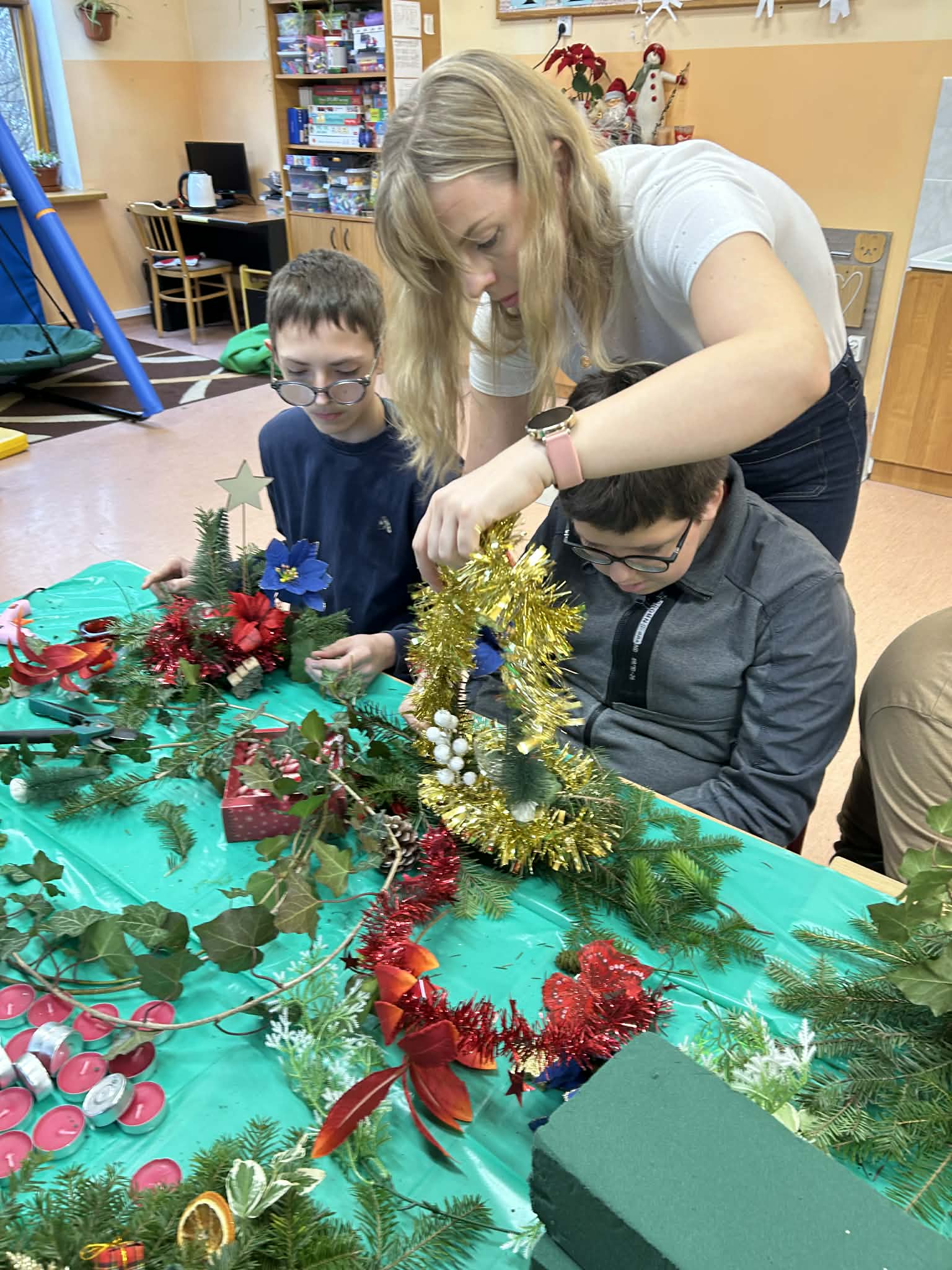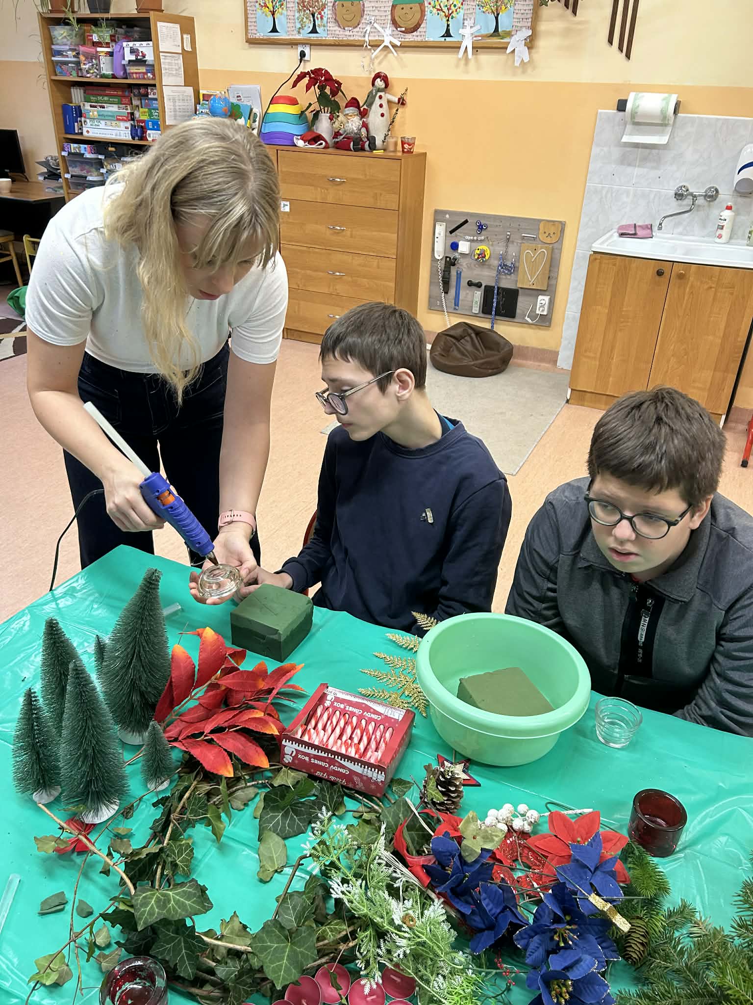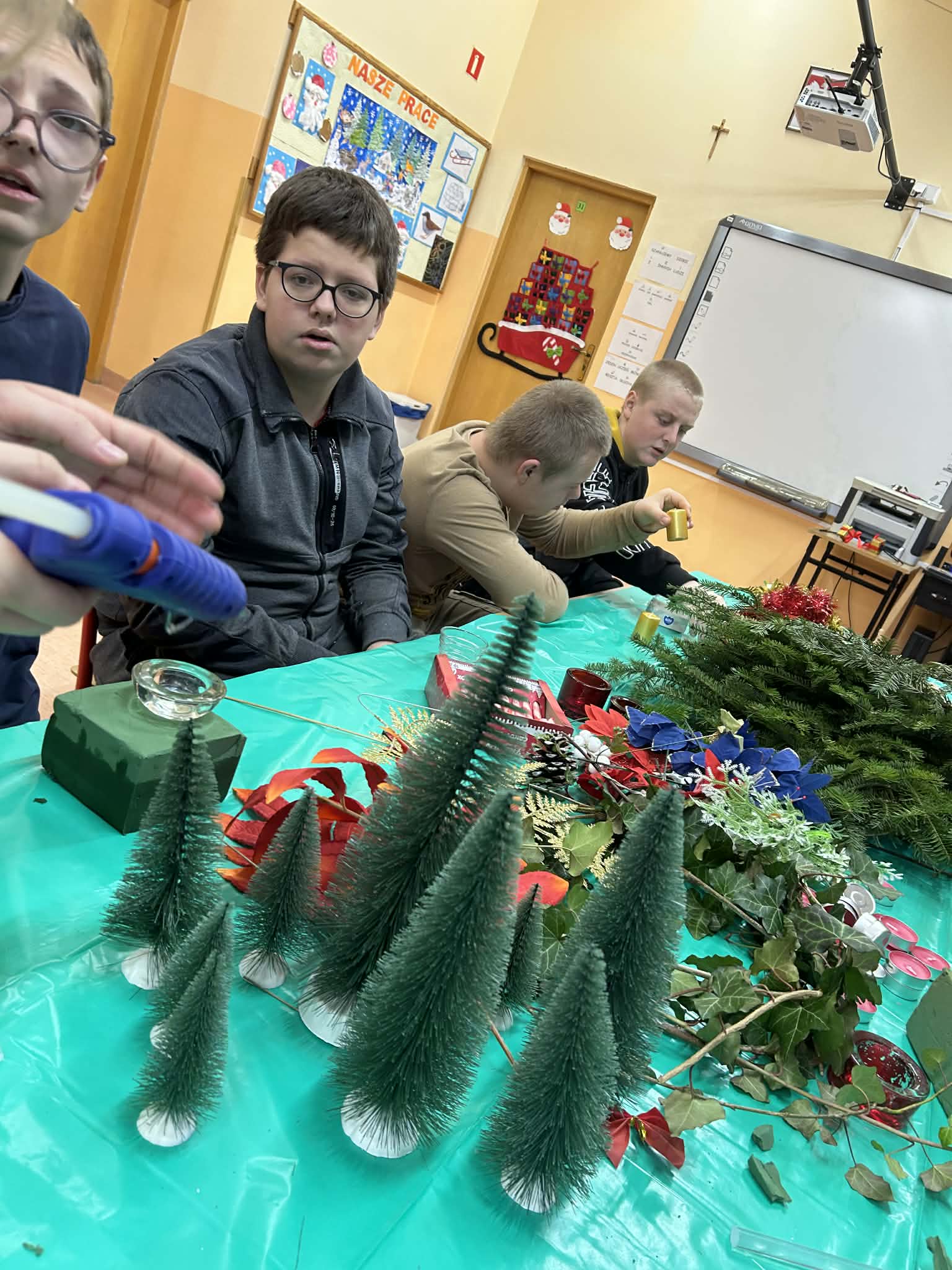 Podczas pracy nie zabrakło również wyjątkowego klimatu – wspólne śpiewanie kolęd sprawiło, że zajęcia nabrały prawdziwie magicznego charakteru. Uczniowie uczyli się współpracy, cierpliwości i dokładności, a przy tym świetnie się bawili.
