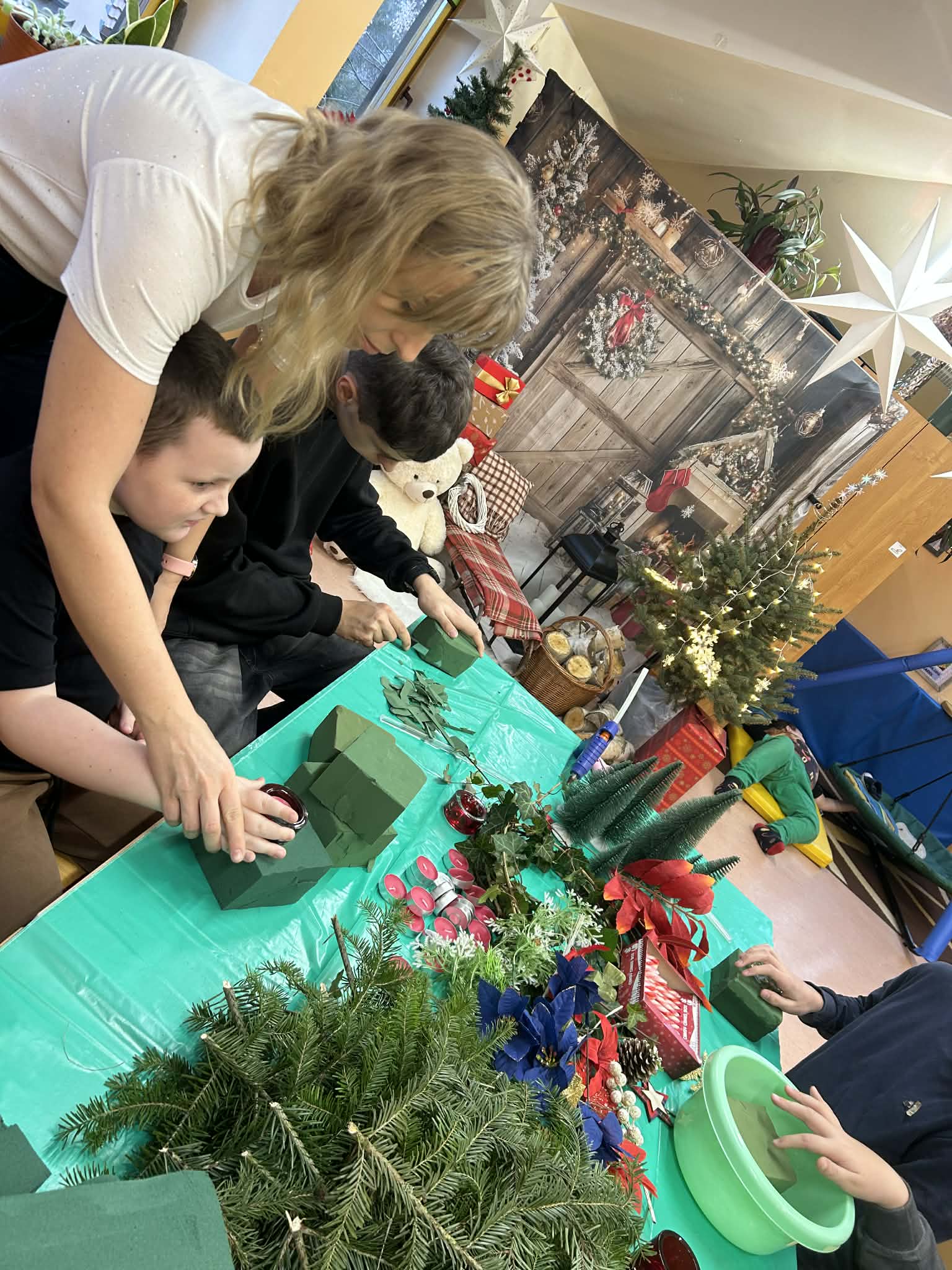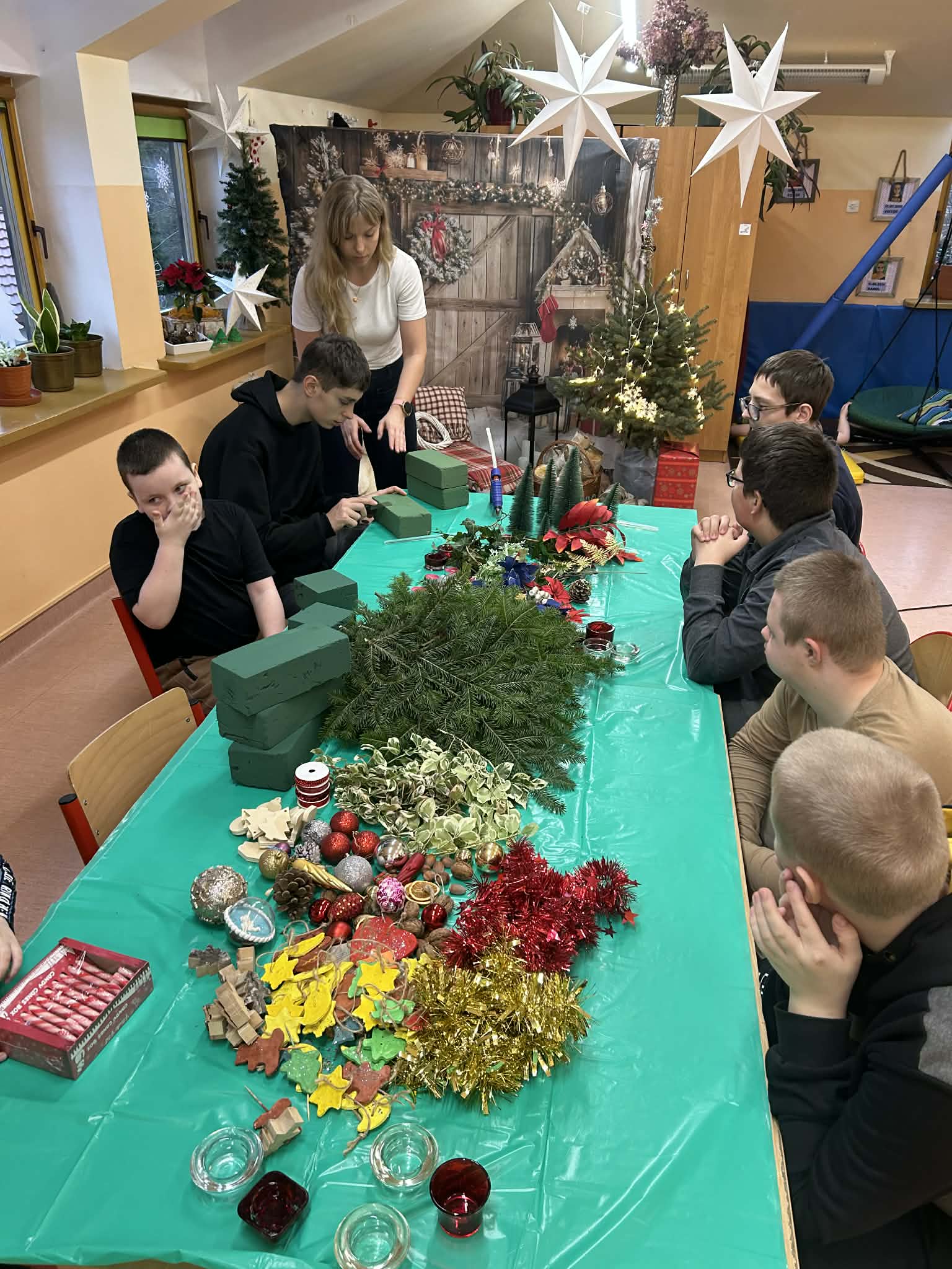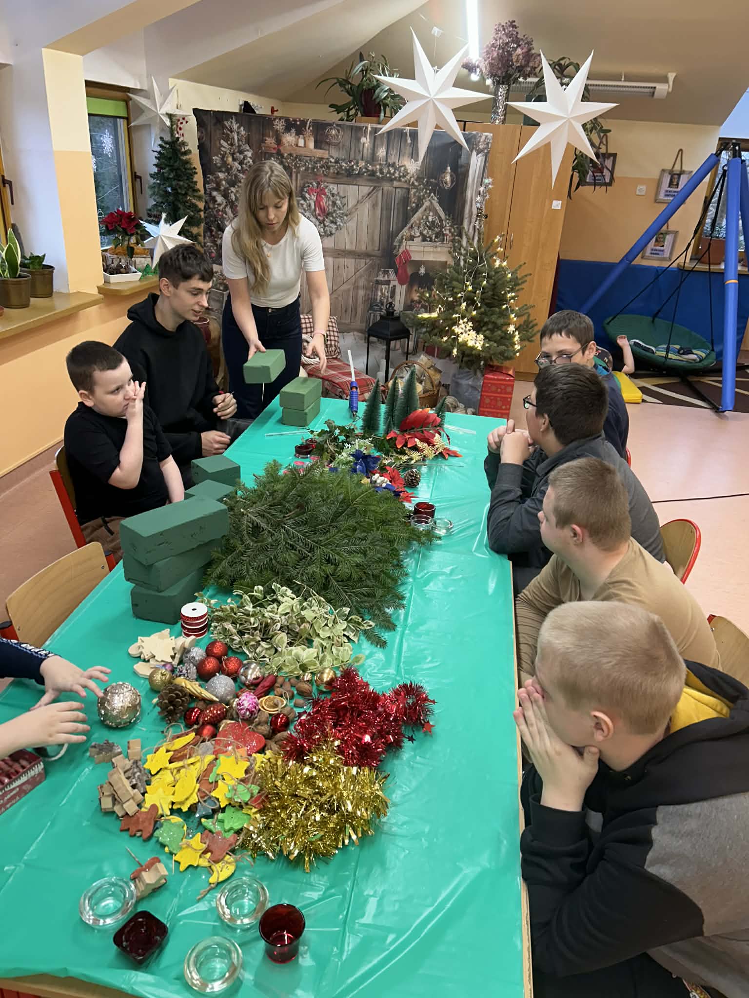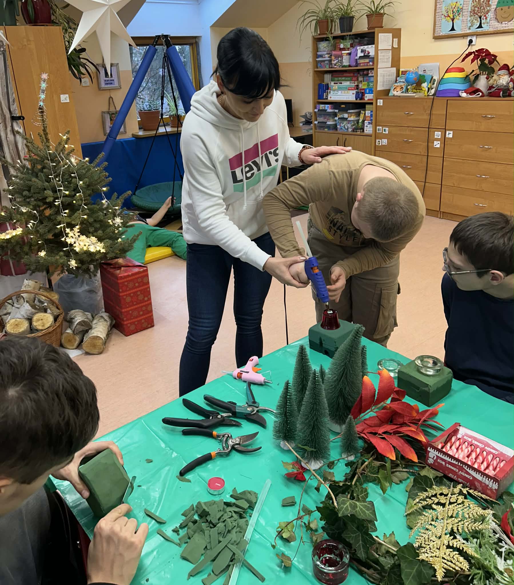 Podczas pracy nie zabrakło również wyjątkowego klimatu – wspólne śpiewanie kolęd sprawiło, że zajęcia nabrały prawdziwie magicznego charakteru. Uczniowie uczyli się współpracy, cierpliwości i dokładności, a przy tym świetnie się bawili.
