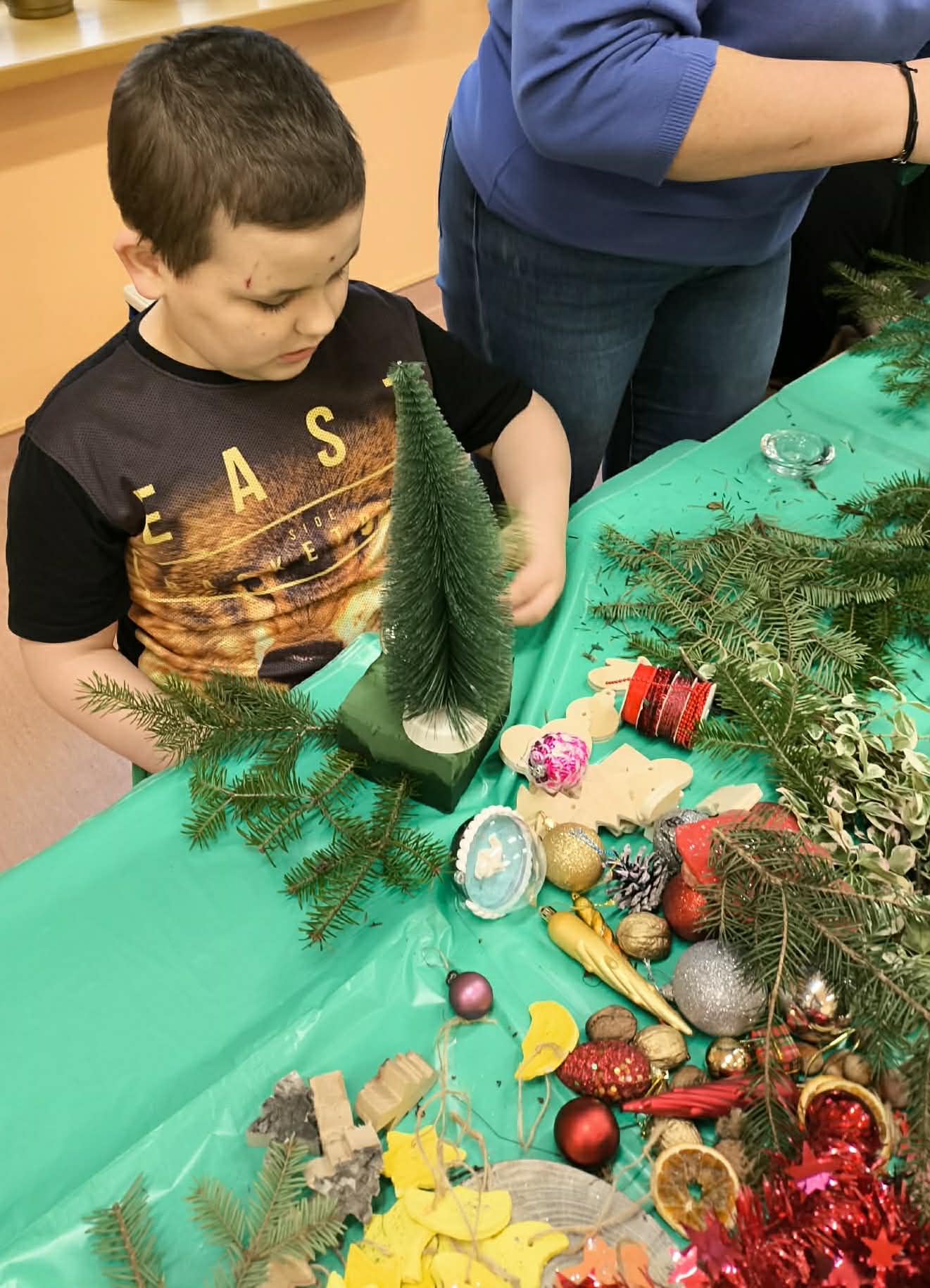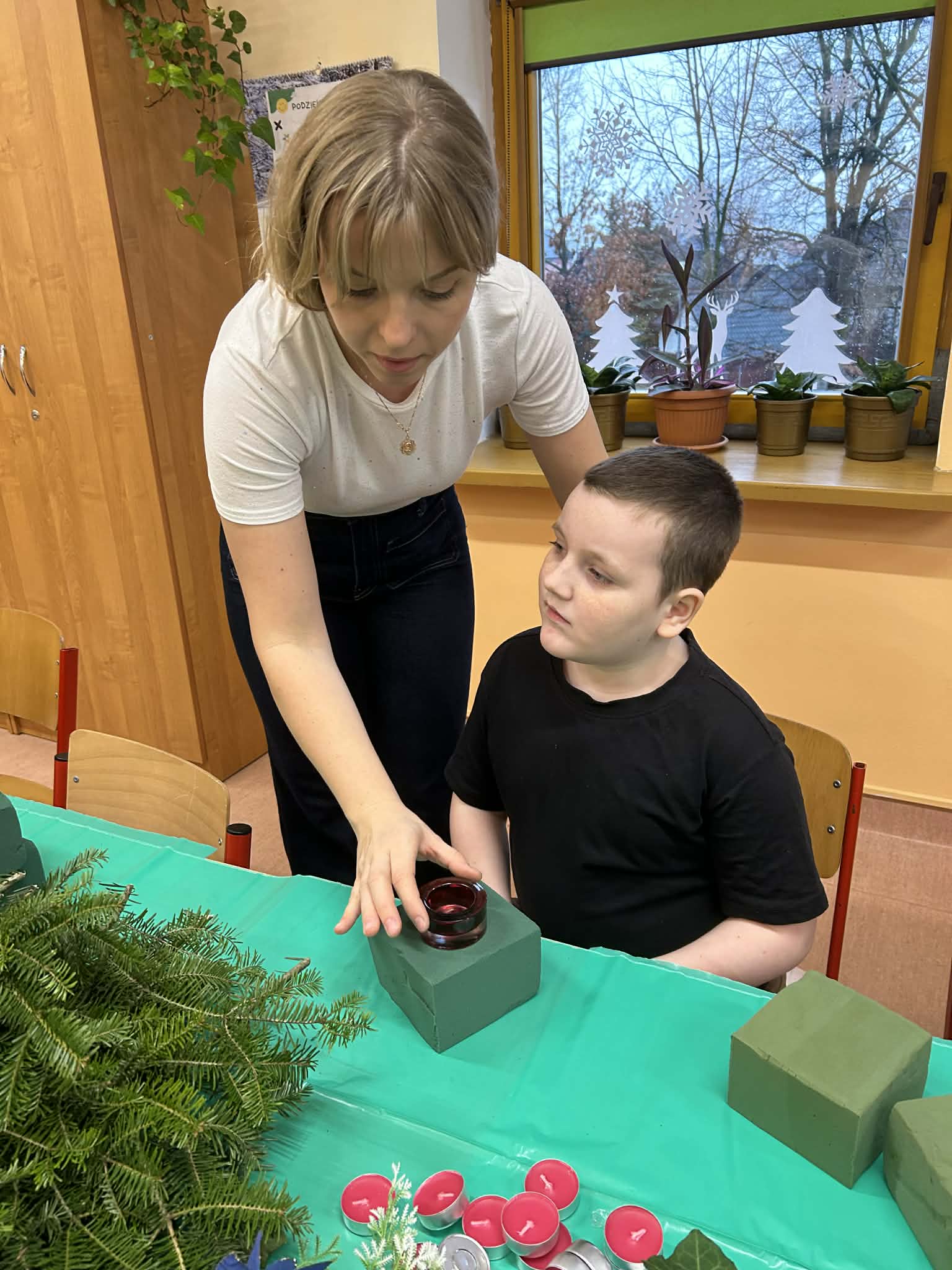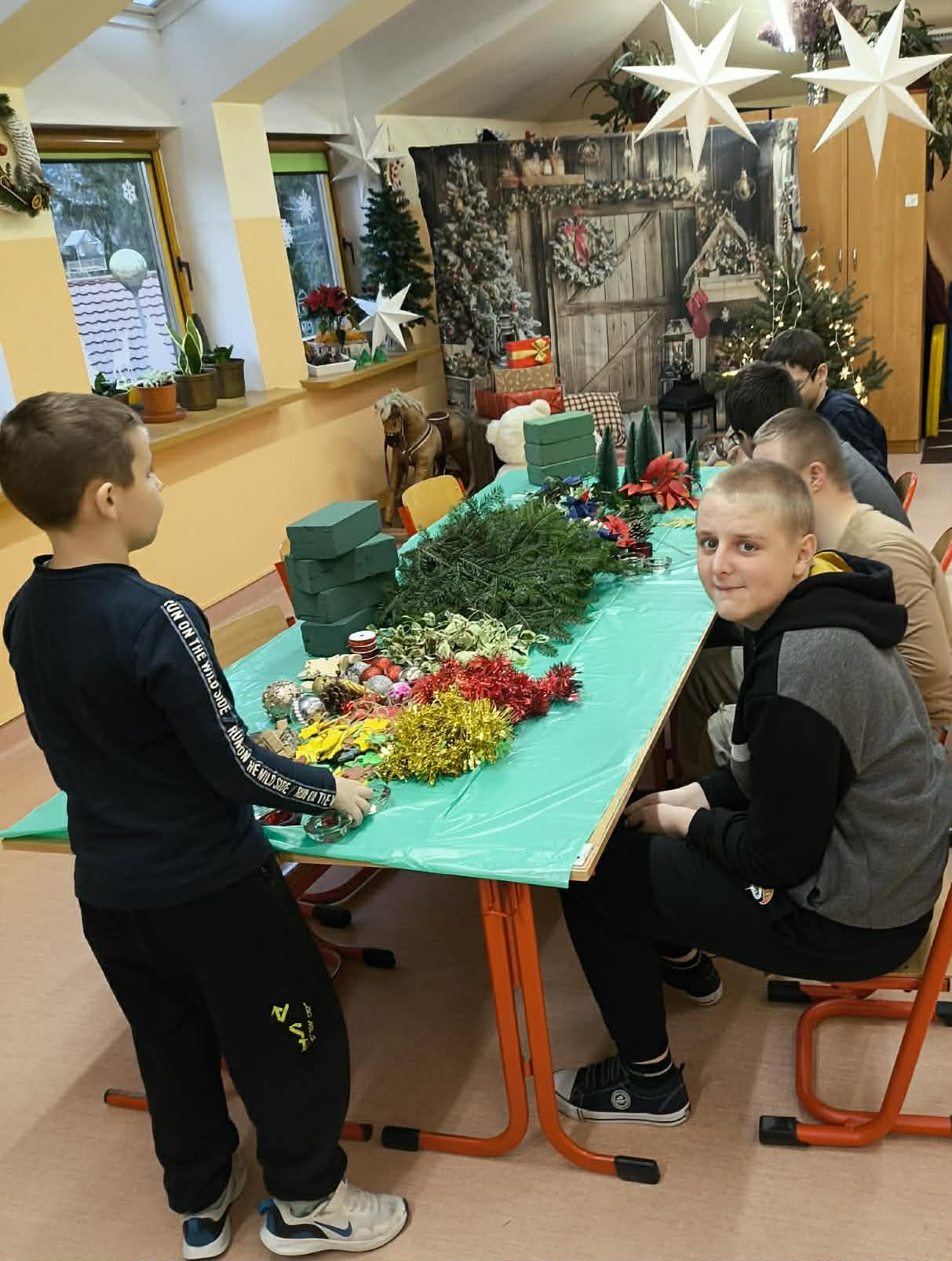 W naszej placówce odbyły się kolejne zajęcia w ramach programu własnego „Sprawne ręce mam, wszystko zrobię sam”. Tym razem uczniowie przenieśli się w świąteczny nastrój, tworząc własnoręcznie bożonarodzeniowe stroiki. Z ogromnym zapałem dobierali gałązki, ozdoby i aromatyczne dodatki, rozwijając swoją kreatywność, precyzję oraz poczucie estetyki.