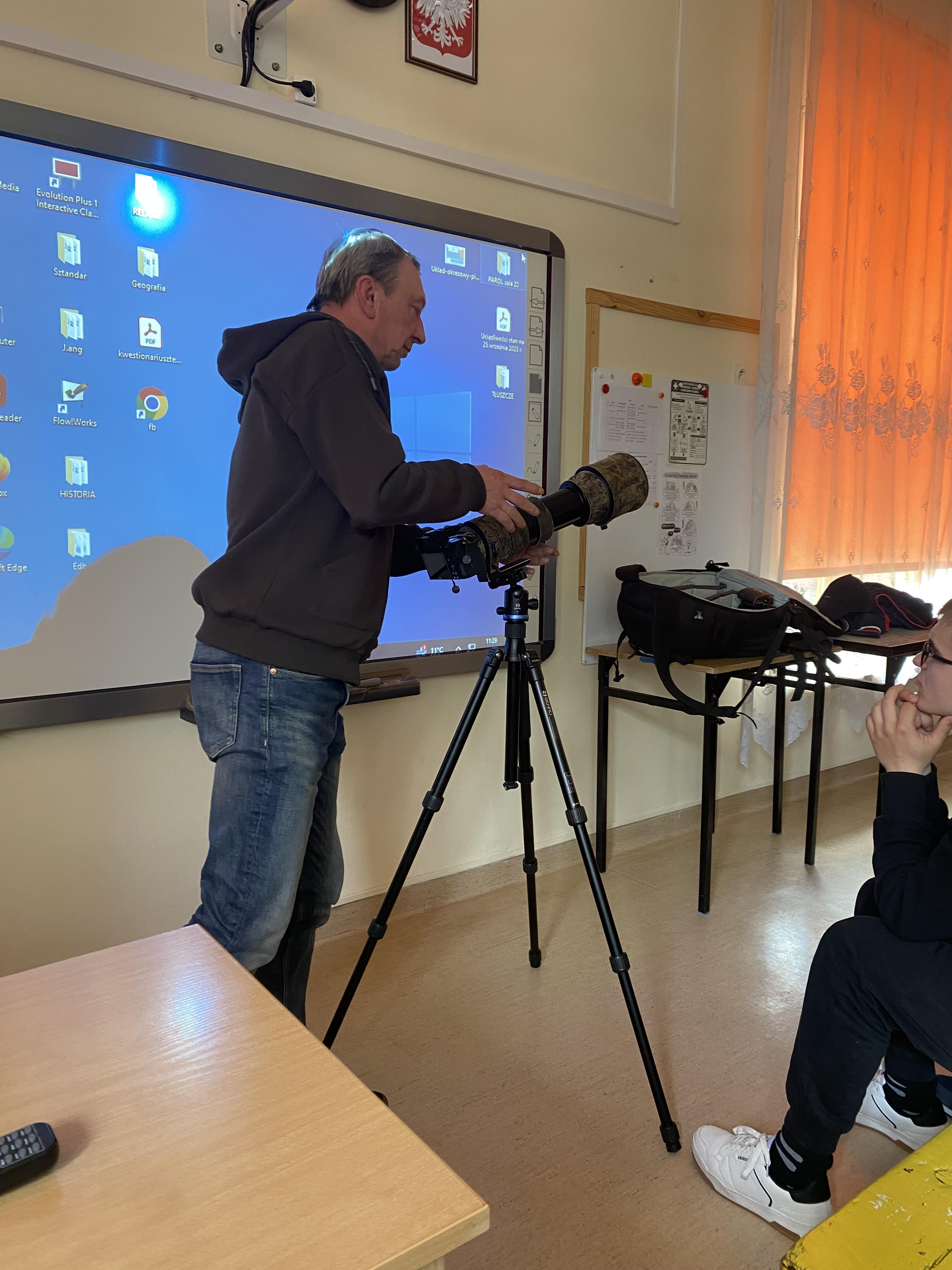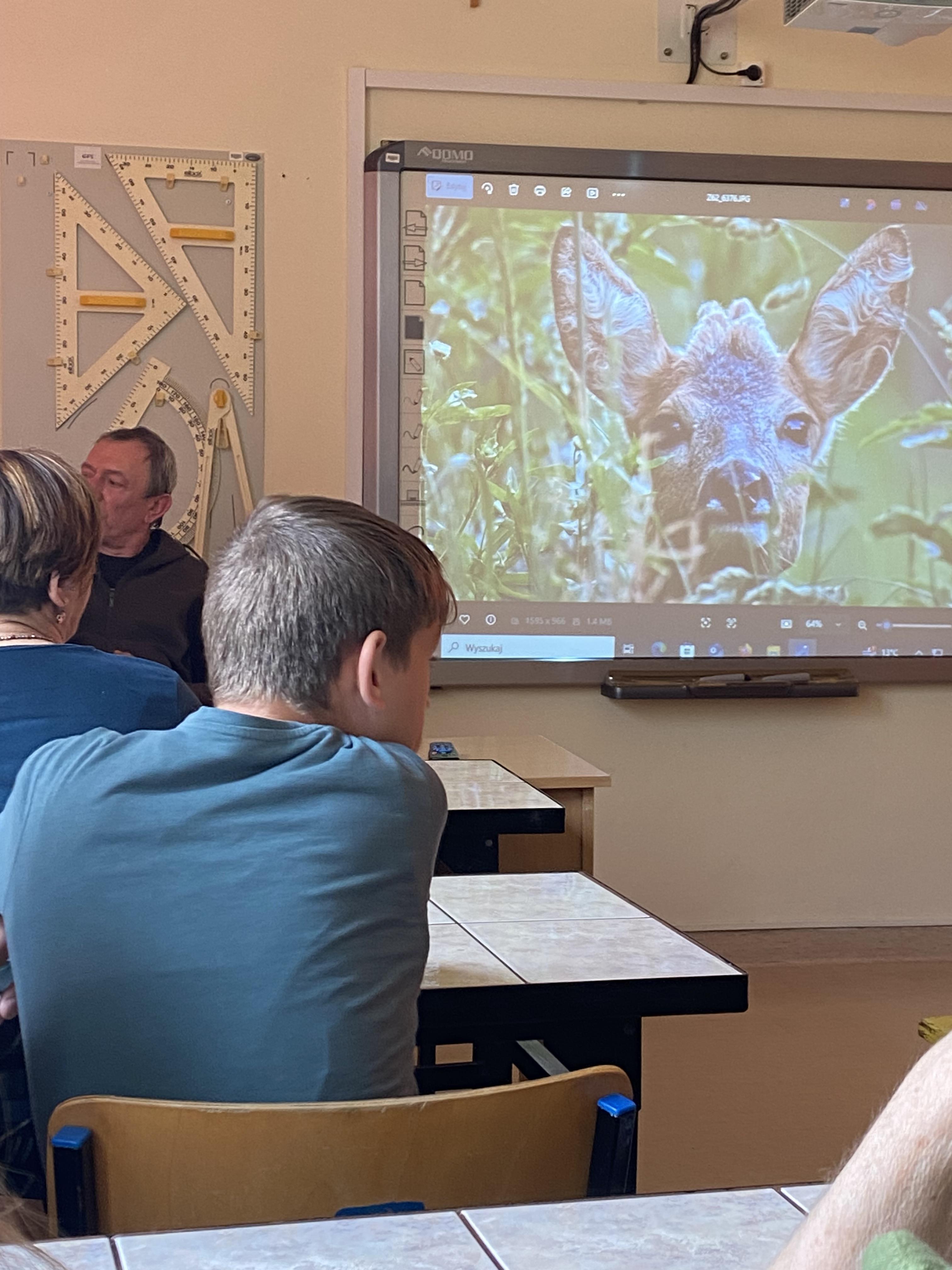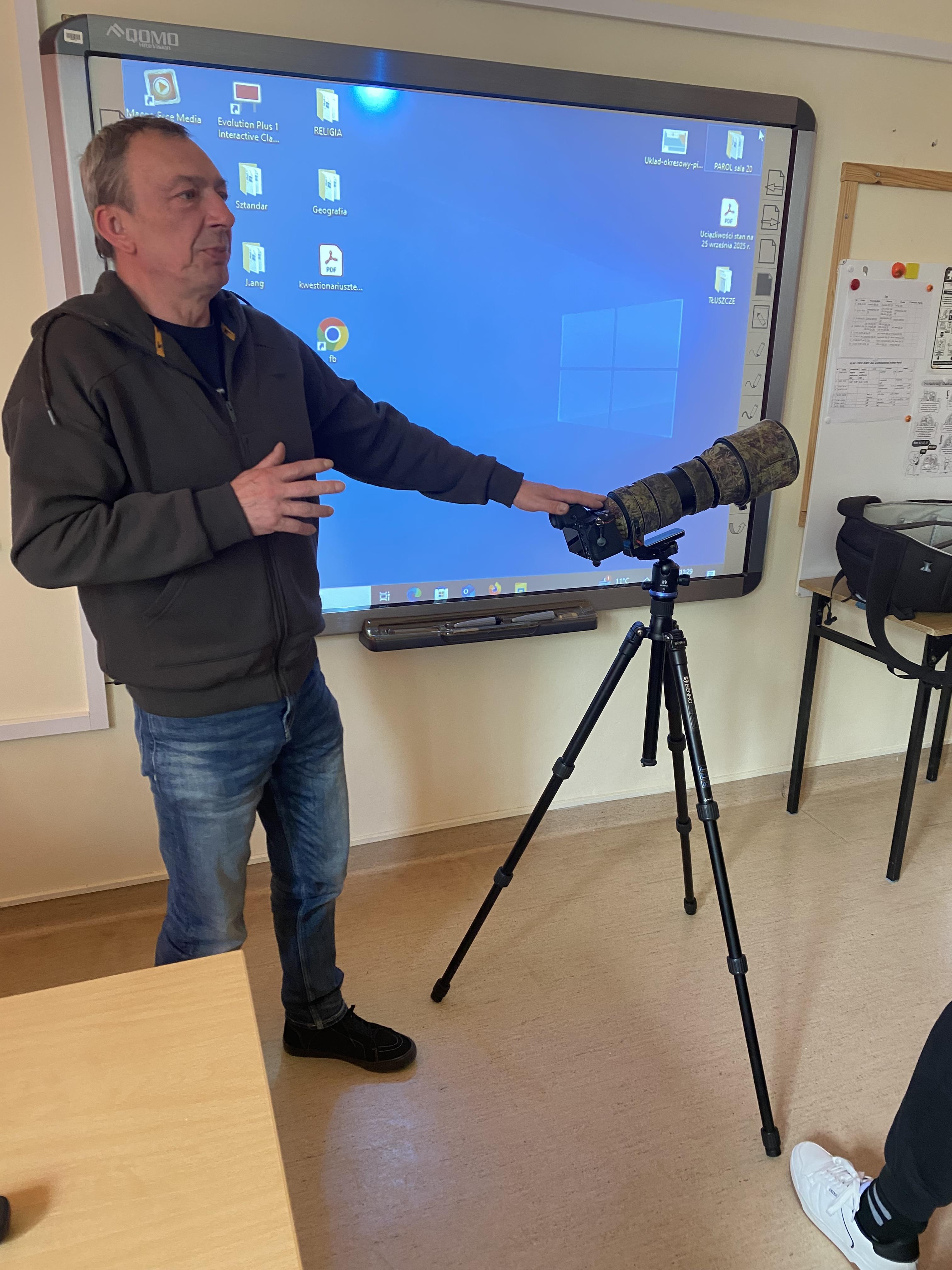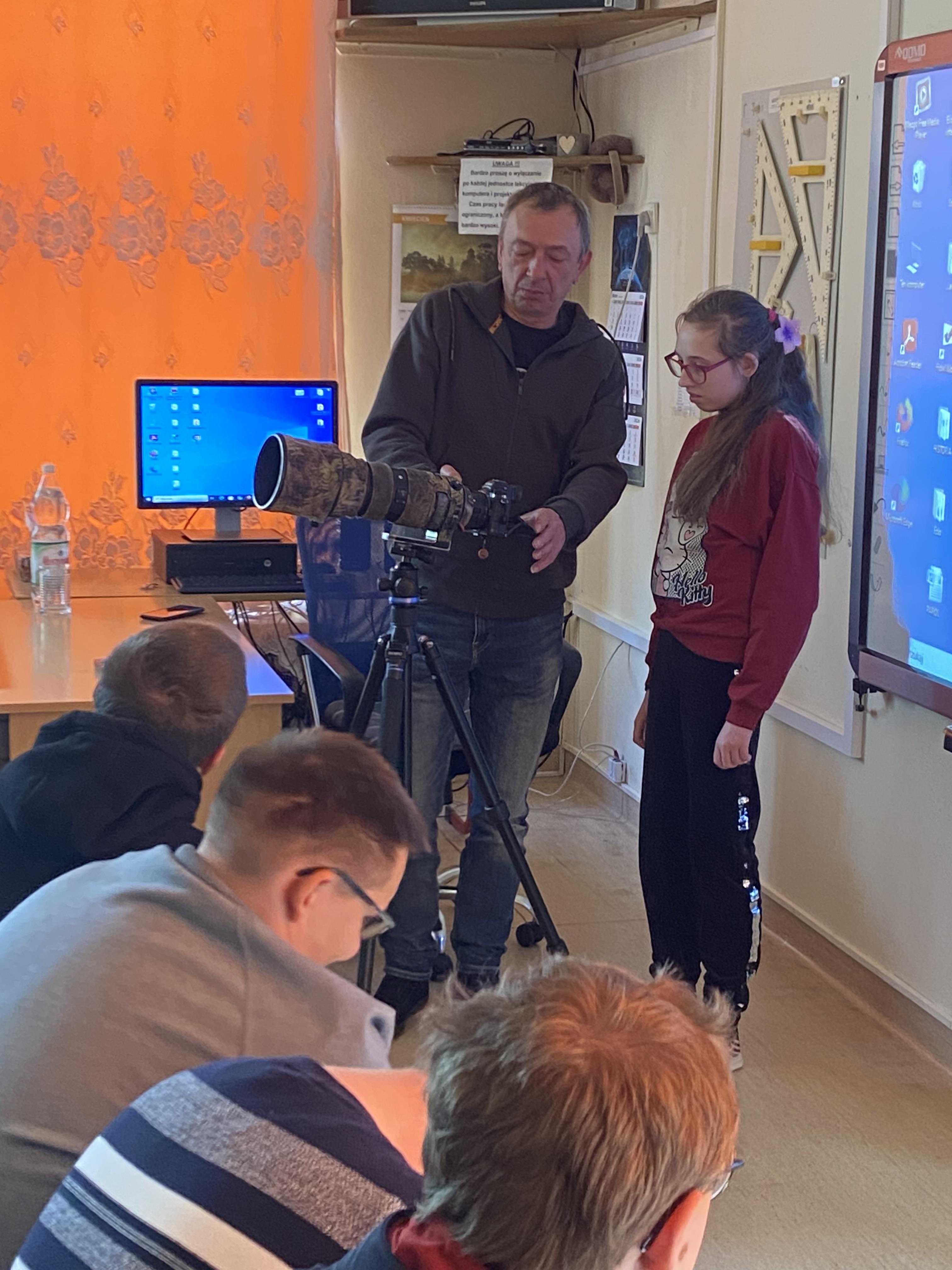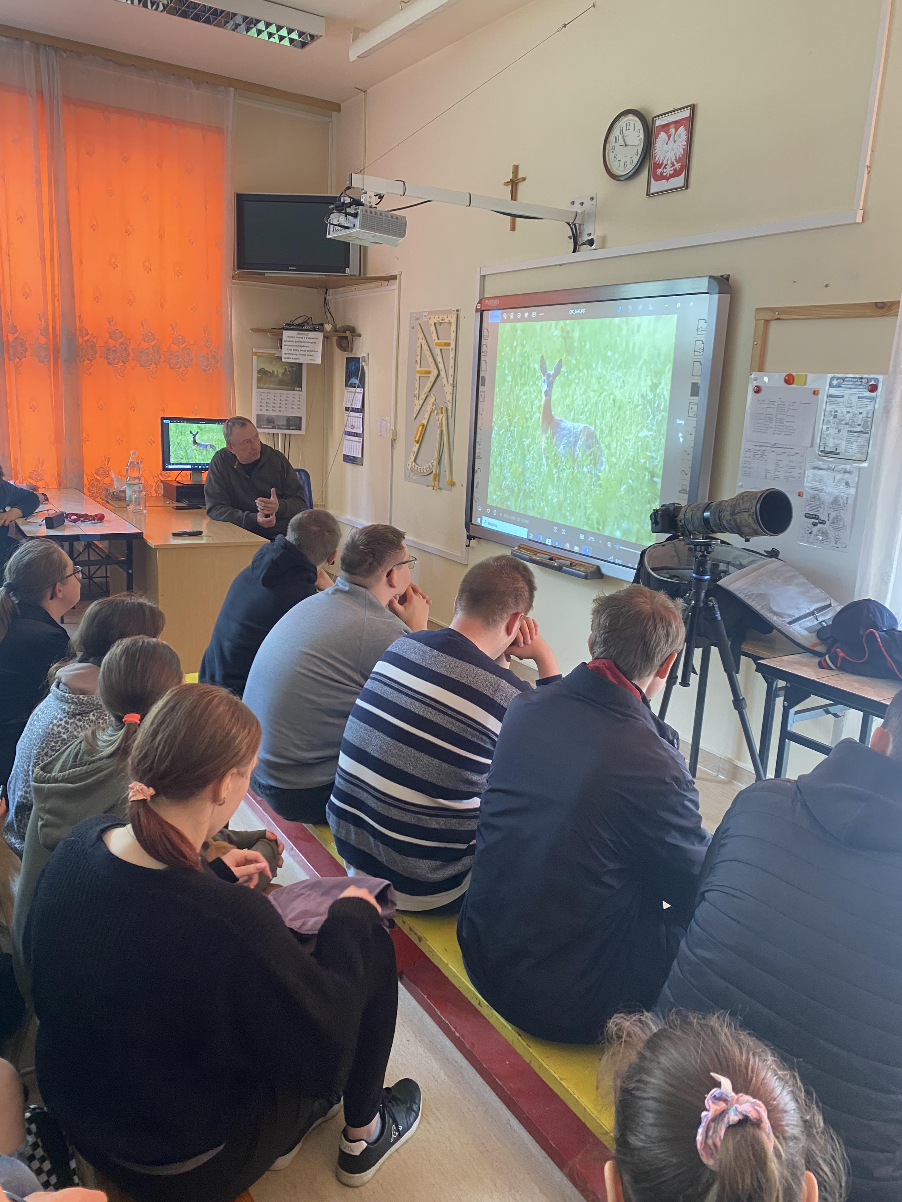 W dniu 23.04.2026 r. nasi uczniowie uczestniczyli w spotkaniu z fotografem przyrody, które zostało zorganizowane w naszym Ośrodku. Gość zaprezentował świat zwierząt i ptaków uchwycony w obiektywie, a następnie przedstawił profesjonalny sprzęt wykorzystywany do fotografowania przyrody.