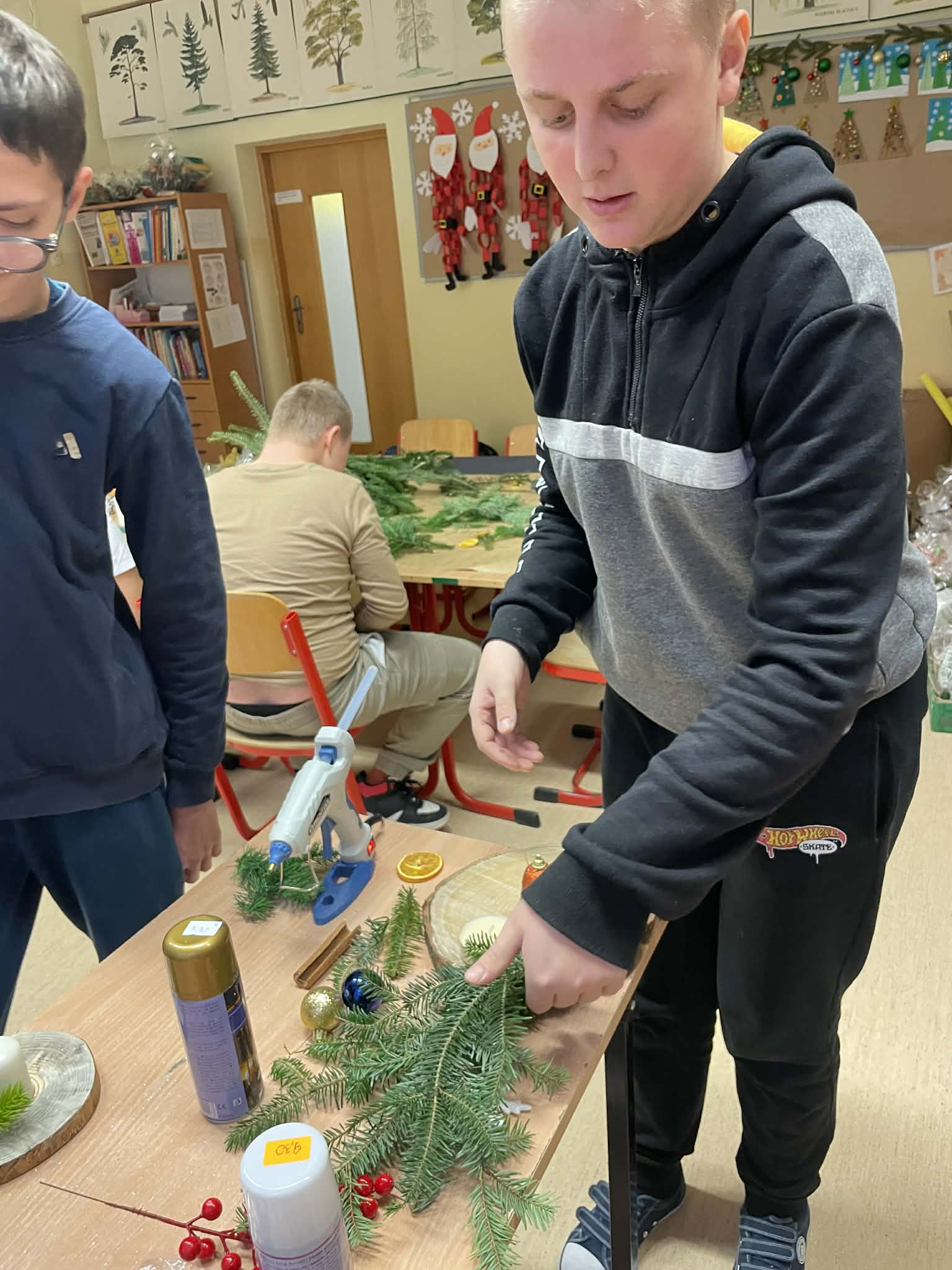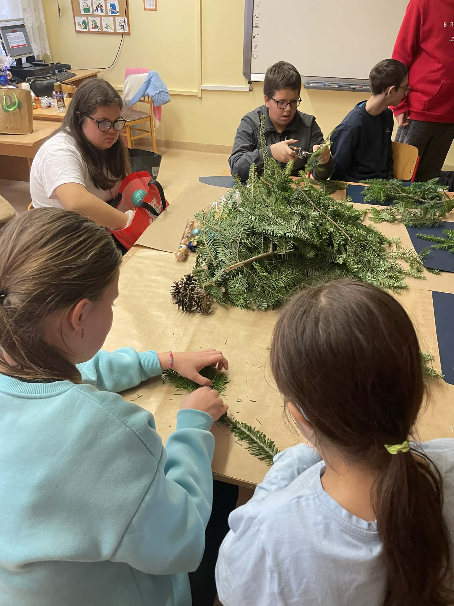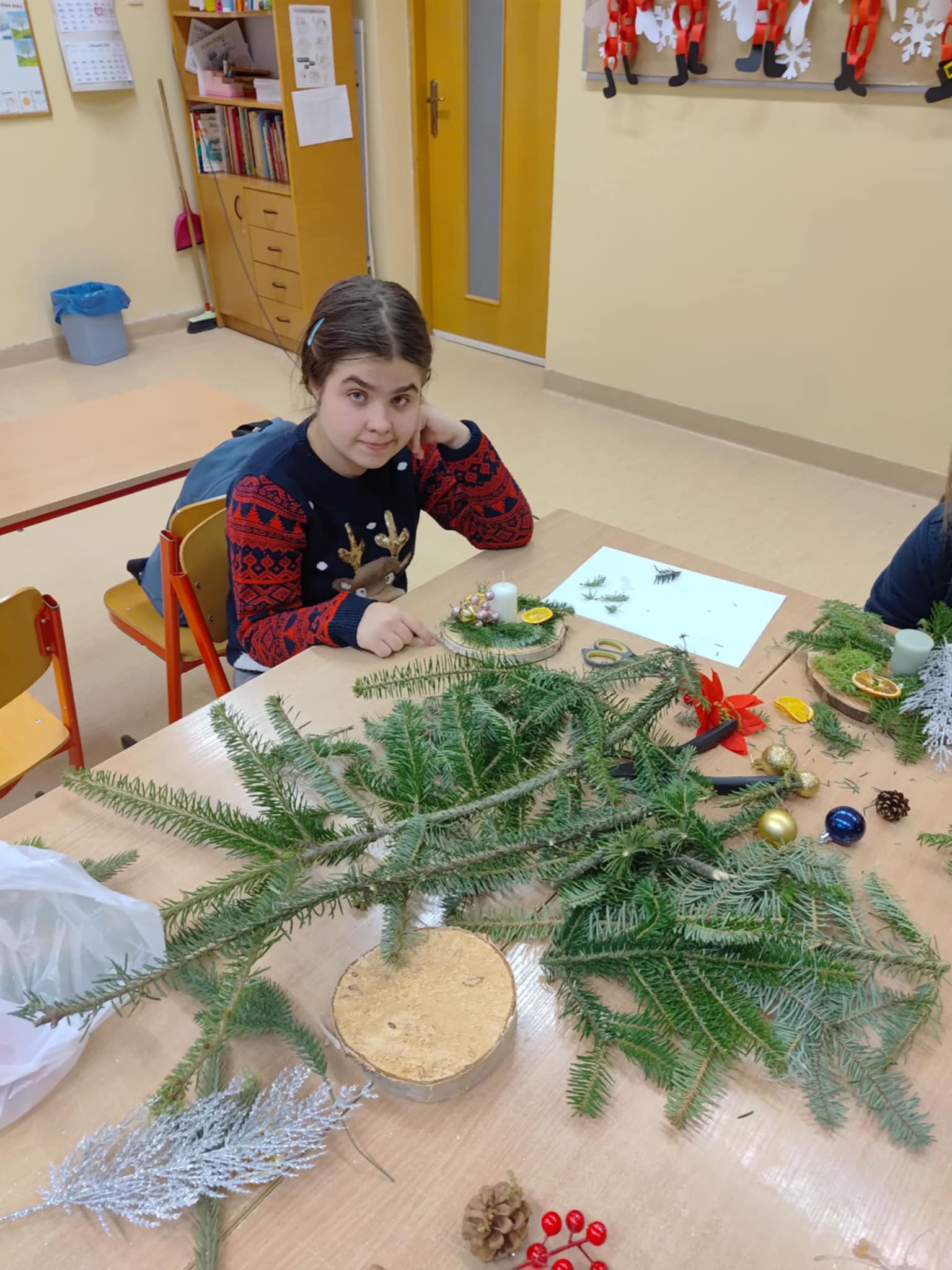 W grudniu uczniowie klas 8B oraz 7D-8D wzięli udział w kreatywnych warsztatach. Podczas zajęć przygotowali piękne stroiki na stół wigilijny oraz upiekli pyszne pierniki. Uczestniczyli także w świątecznym kiermaszu pt. „Gwiazdka dzieciom”, podczas którego dokonywali zakupów i sprzedaży.