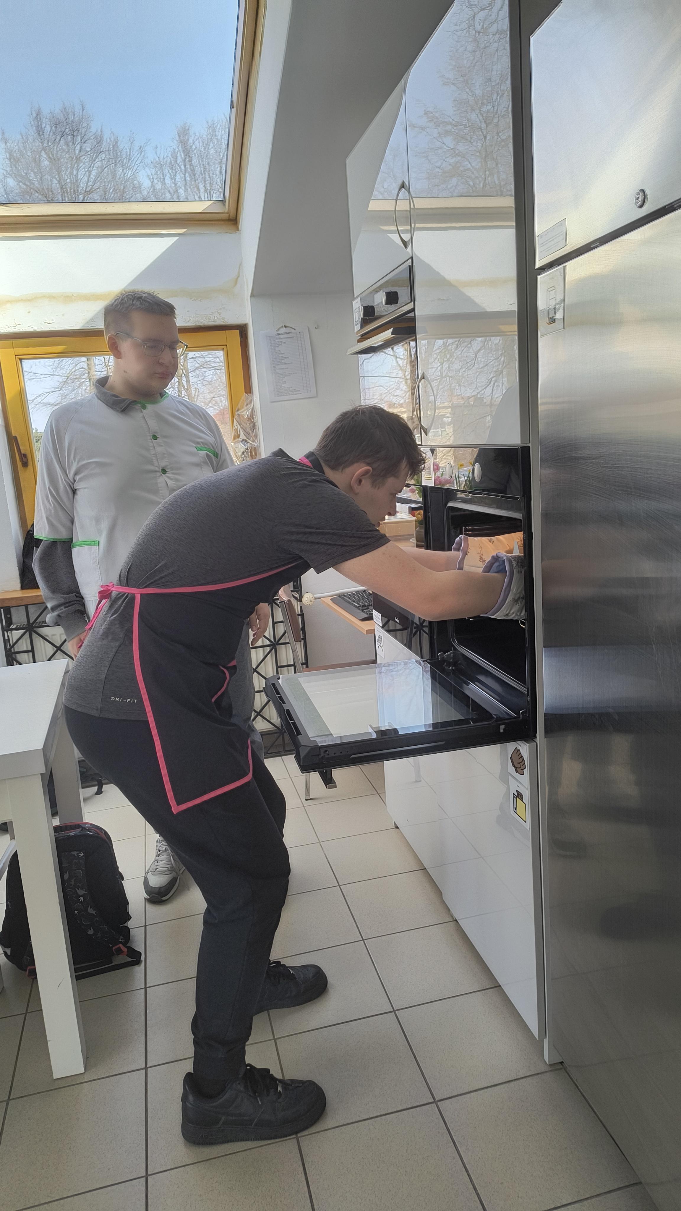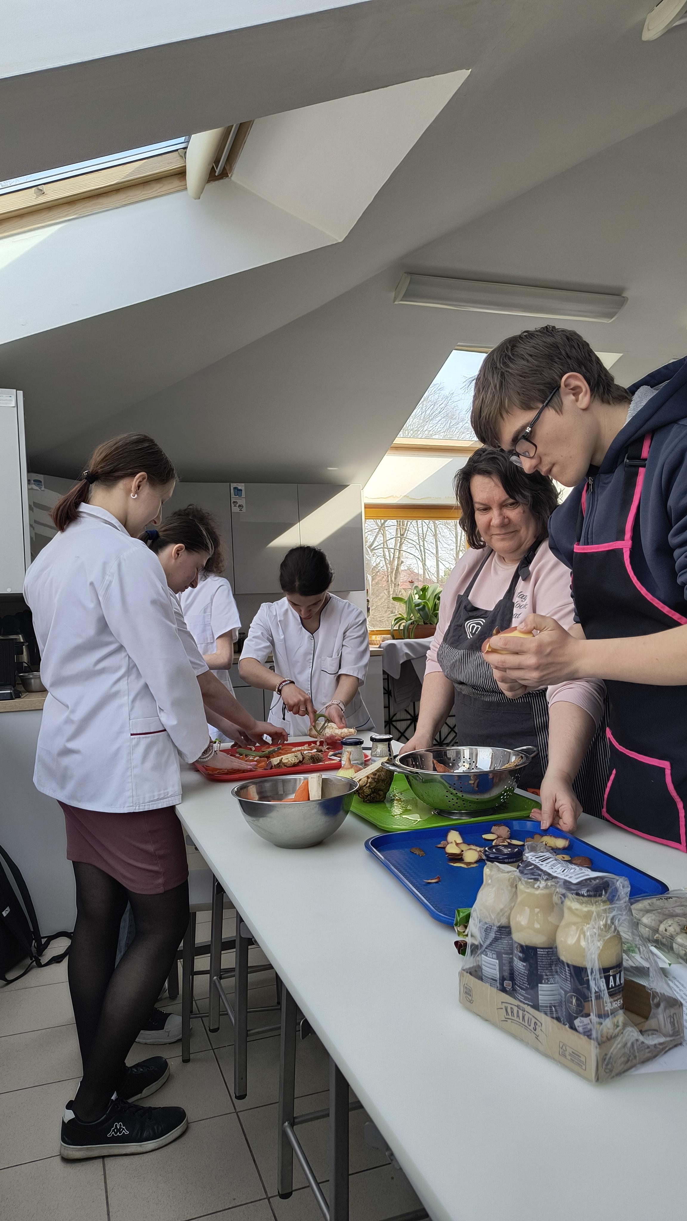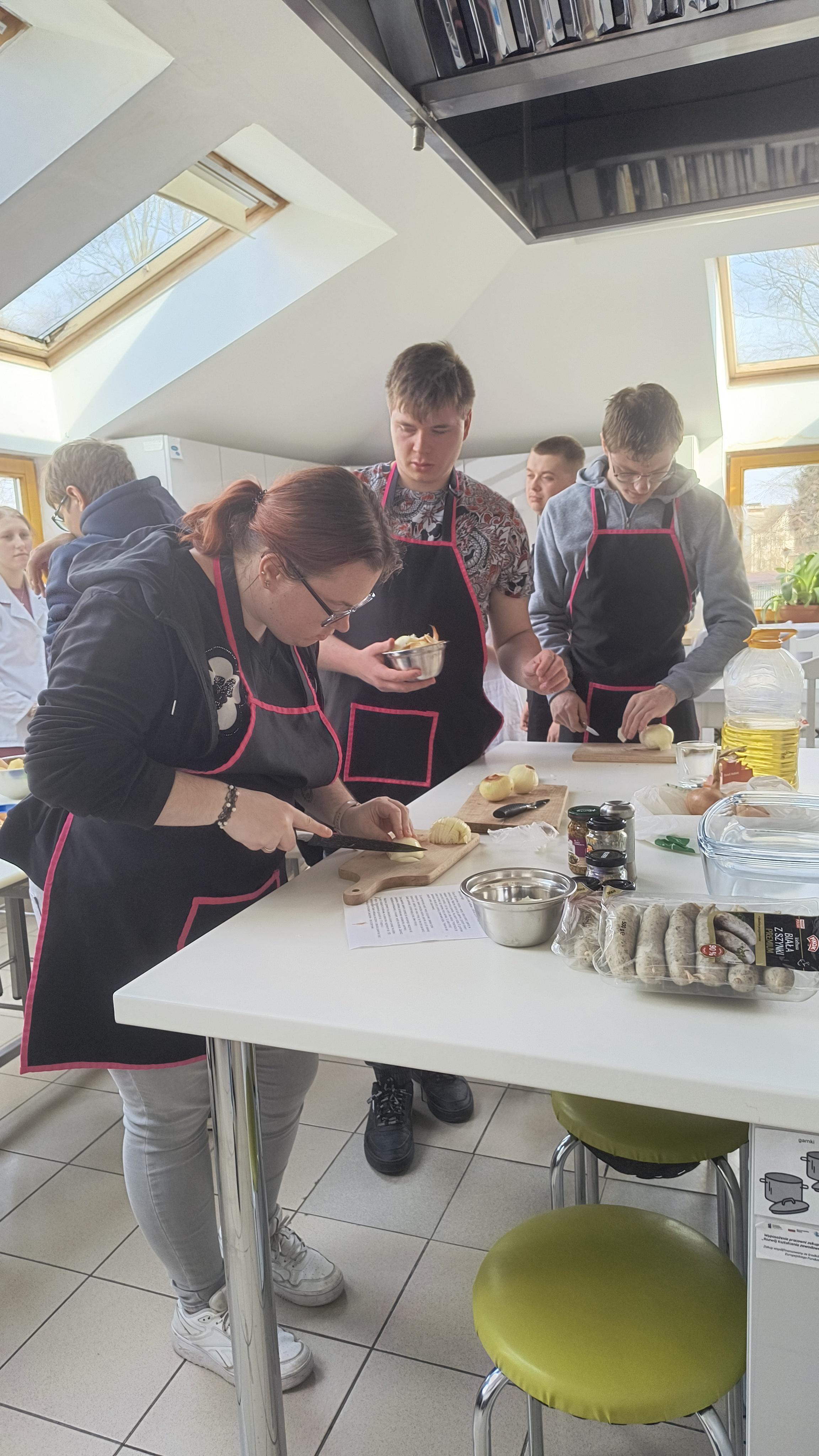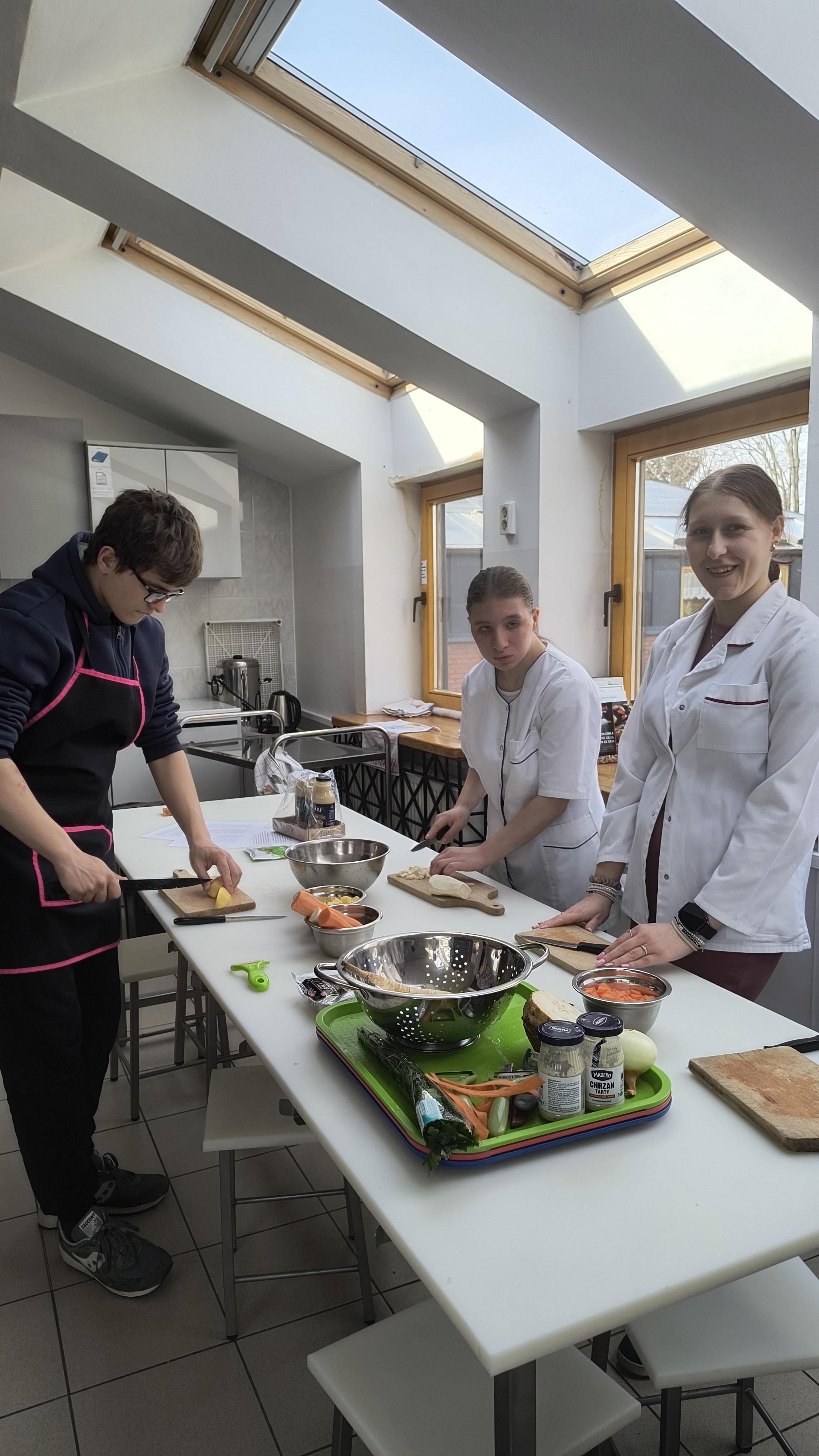 Za nami ostatnie działanie w ramach projektu uczniowskiego „Od kuchni do sukcesu”. Uczniowie klas 1C-3C oraz 3A Szkoły Przysposabiającej do Pracy wzięli udział w warsztatach kulinarnych. Tym razem młodzież zmierzyła się z tradycyjnymi potrawami wielkanocnymi. Pod czujnym okiem profesjonalnego kucharza uczniowie wspólnie przygotowali: aromatyczny, domowy żurek, pieczoną białą kiełbasę z cebulką oraz pyszną, puszystą babkę cytrynową.